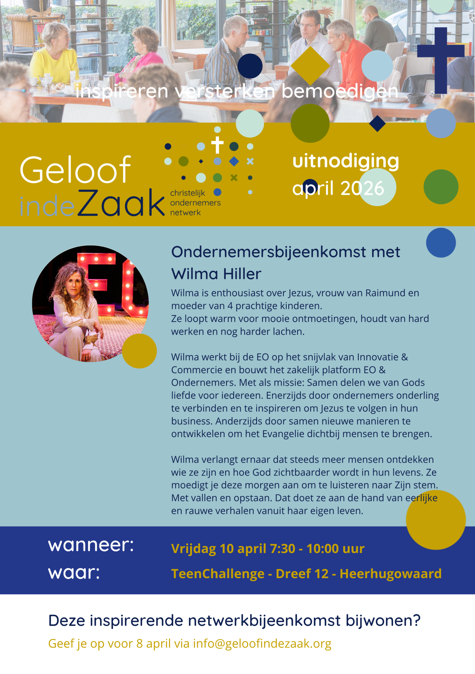 We nodigen je uit voor de ondernemersbijeenkomst van april. Deze ochtend spreekt Wilma Hiller (EO & Ondernemers) bij ons. Wilma is enthousiast over Jezus, vrouw van Raimund en moeder van 4 prachtige kinderen. Ze loopt warm voor mooie ontmoetingen, houdt van hard werken en nog harder lachen. Wilma werkt bij de EO op het snijvlak […] |